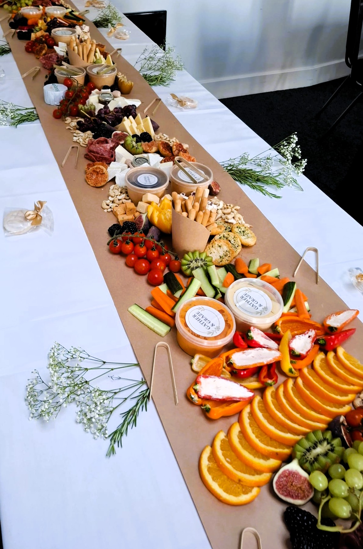 A beautifully curated display featuring a selection of artisanal cheeses, cured meats, crackers, fresh fruits, nuts, and chutneys. Each table can be tailored to suit your taste or dietary needs.