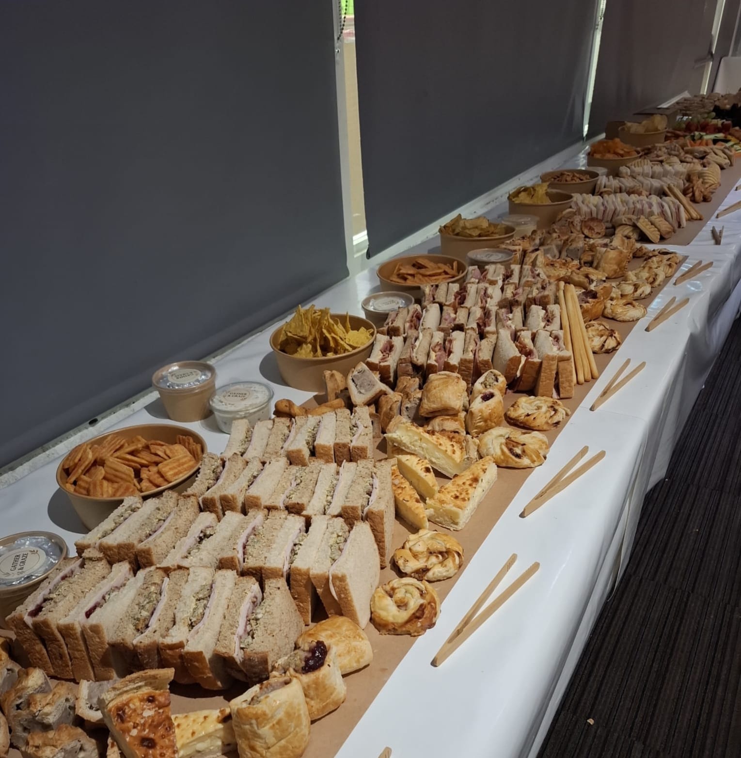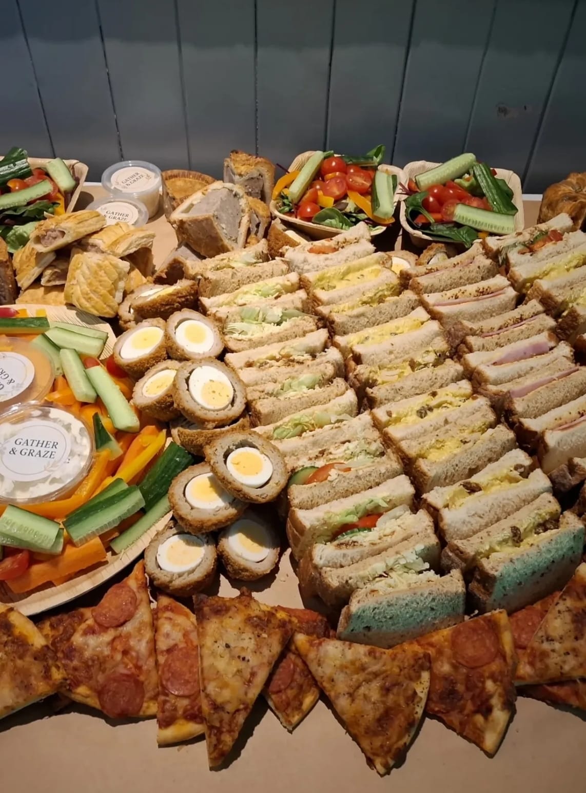 A generous assortment including sandwiches, sausage rolls, pork pies, crisps, sweet treats, fresh fruits and vegetables, dips, scotch eggs, pizza slices, and quiche. Sweet grazing table also available as an optional add-on (extra charges apply).
